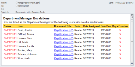 You are listed as the [document role]* for the following approved documents with overdue reader tasks: [document list