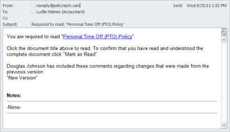 You are required to read "[document title]"[due date text]*. Click the document title above to read. To confirm that you have read and understood the complete document click "Mark as Read". [escalation text]† [version change summary]‡ Notes:§ [note text] *The following text is Included if a due date is specified: " before [due date]." †Included if a due date is specified and will be one of the following: "You have only [integer] DAY(S) REMAINING before it is overdue"; "It is due today!"; "It is [integer] DAY(S) overdue!" ‡Included only if the task is for a new version of an existing document. If the document owner has included a summary of the changes made, the following text is included: [document owner's name] has included these comments regarding changes that were made from the previous version: "[comment text]" Otherwise, the following text is included: [document owner's name] has not included any comments regarding changes that were made from the previous version. §If one or more notes exist, each note's subject (in bold font) and body are listed. Otherwise, the note text is "-NONE-." |