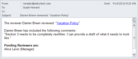 The reviewer [reviewer's name] reviewed: "[document title]" [reviewer's name] has included the following comments:* [comment text] Pending Writers are:* [pending reviewer list]