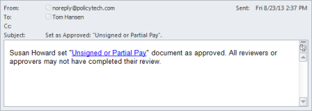 [document control administrator's name] set "[document title]" document as approved. All reviewers or approvers may not have completed their review. |
