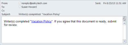 Writer(s) completed "[document title]". If you agree that this document is ready, submit for review. |