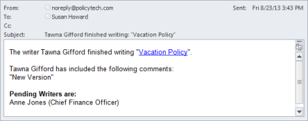 The writer [writer's name] finished writing: "[document title]" [writer's name] has included the following comments:* [comment text] Pending Writers are:* [pending writer list]