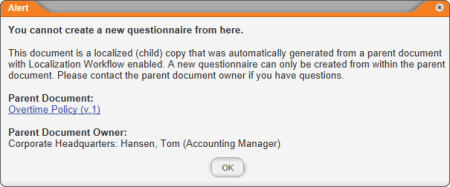 - If this localized copy has been synced with the master document and a questionnaire has not been added to the master, you will see a prompt like the one below and you will not be able to add a questionnaire to the localized copy.