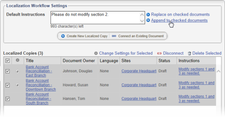 - Select the check boxes of one or more copies, and then click Append to checked documents. The text currently in the Default Instructions box is added on a new line after any existing instructions.