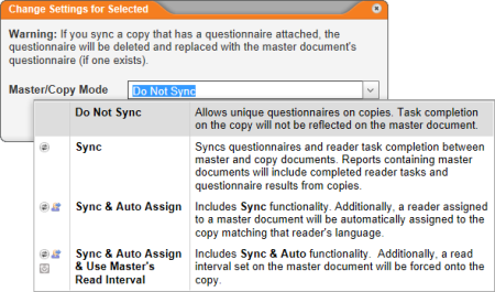 You can quickly see the current Master/Copy (sync) Mode settings for localized copies by the icons displayed in the settings column (with