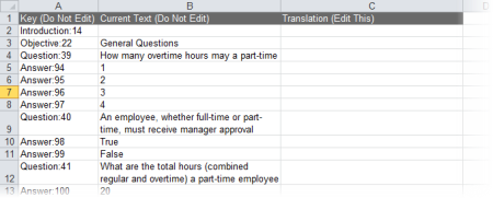 - In the Translation (Edit This) column, type the translations for or modifications of the text in the Current Text (Do Not Edit) column. To use a piece of current text as it is, leave its corresponding translation cell empty.