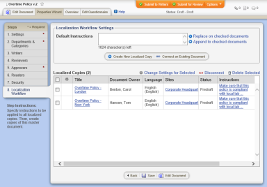 Important: The contents of the new versions of the localized copies created from this new version of the master document will initially be the same as the new version of the master document. However, each localized copy owner can choose to replace these contents with those of the localized copy's previous version. This functionality is especially useful for when localized copies have been translated. A localized copy owner can restore the previously translated contents and then make the same changes in the translation as were made in the new version of the master document rather than having to retranslate the entire document.