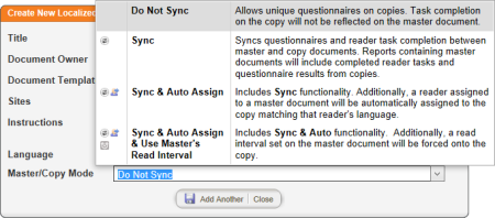 This mode includes the same functionality as the Sync mode. It also checks the Language selection for each assigned reader and automatically assigns each reader the localized copy with that language selected. If there is no localized copy for a reader's selected language, that reader is assigned the master document. With this mode selected, all copy documents inherit the master document's reader assignments but also allow copy-specific reader assignments.