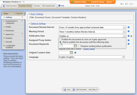 - For Publication Date, click Wait to publish the document until the following date. Click