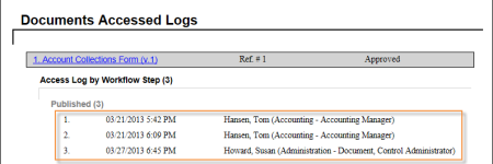 Shows which documents were accessed by which users within a specific date range.