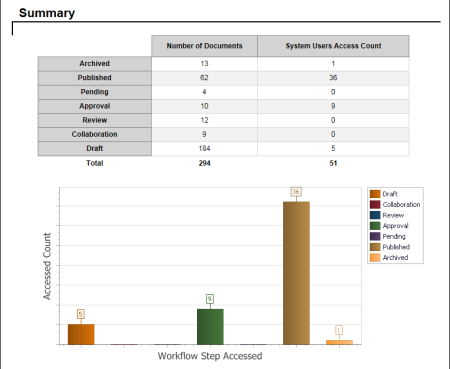 - Include Graphs: Adds a graph to the Summary area of the report. The graph shows the number of users who accessed the selected documents in each status.