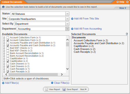 - Select documents to include in the report (see Selecting Documents for help).
