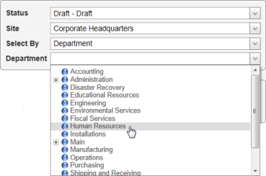 - If the Select By setting is any other option, in the list below Select By, click an item. For example, if you click Department for Select By, then , in the Department list, click a department.