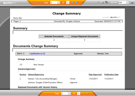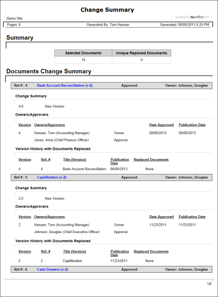 When submitting a new document or a new version of an existing document to review or approval, a document owner must include the reason for creating the new document or a summary of changes to the existing document. This report shows the change summaries written by document owners upon submitting those documents (new or new version) for review or approval.