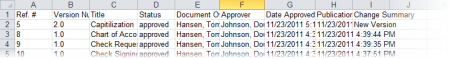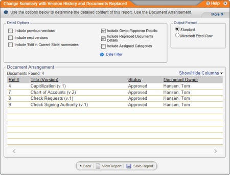 Include Owner/Approver Details. Adds the names and job titles (if included in the users' profiles) of the document owner and approver of each document version.