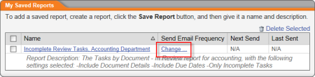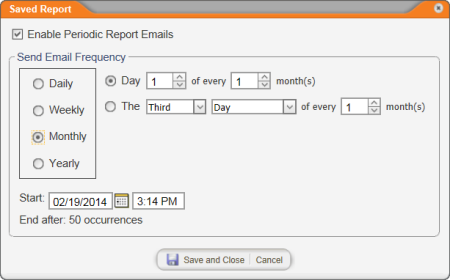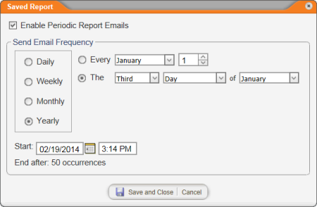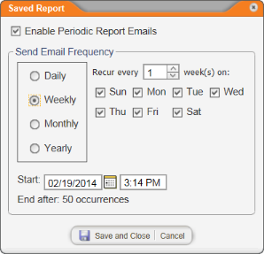 After saving a report (see Saving a Report's Settings), you can set up a schedule for automatically generating and emailing yourself a report based on the saved settings.