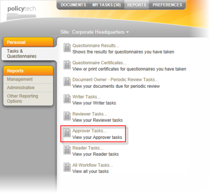 - Under Personal, click Tasks & Questionnaires, and then click Approver Tasks.