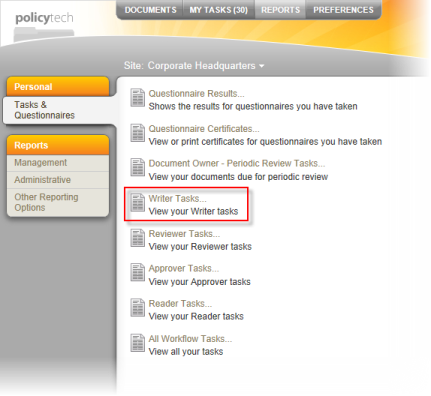 - Under Personal, click Tasks & Questionnaires, and then click Writer Tasks.