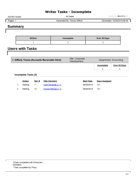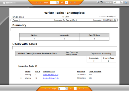 If you select Incomplete Tasks with Upcoming Levels, information will be shown about any writing tasks you have not yet received notification for. These could be tasks for documents that have not yet reached the writing status or tasks for documents currently in approval but that have not yet reached your assigned writing level.