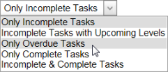- In the Task Options list, click a single task status (incomplete, incomplete with upcoming levels, overdue, or complete) or click Incomplete & Complete Tasks.