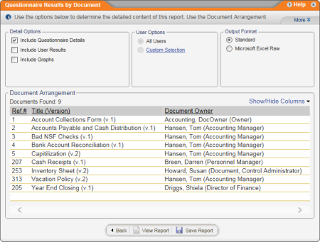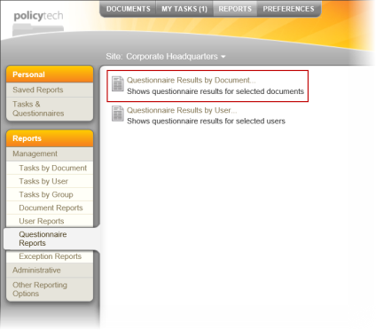 - Click Management, click Questionnaire Reports, and then click Questionnaire Results by Document.