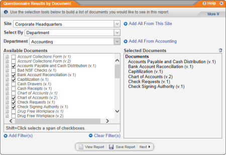 - Select documents to include in the report (see Selecting Documents for help).