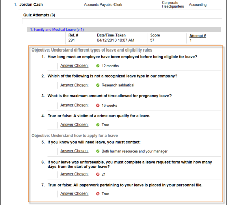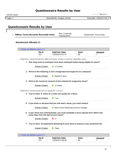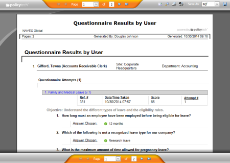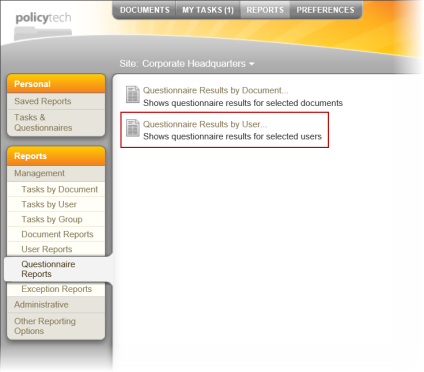 - Click Management, click Questionnaire Reports, and then click Questionnaire Results by User.