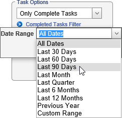 - If you selected Only Complete Tasks or Incomplete and Complete Tasks, the Completed Task Filter option appears. To show only the selected tasks that fall within a certain date range, click Completed Task Filter. In the Date Range list, click a date range, and then click Apply. If you click Custom Range, also type or select From and To dates, and then click Apply.