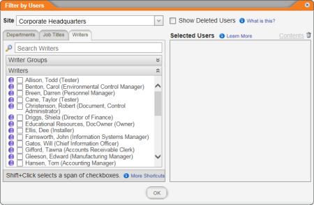 - User Options lets you filter the selected documents to show only those to which selected users are assigned. Do one of the following: