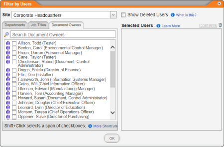 - To filter the document list by specific user assignments, click Custom Selection.