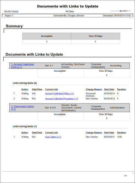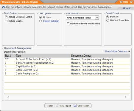 Shows the status of all tasks for documents with outdated links. You can choose to include only those tasks that are incomplete, overdue, or completed.