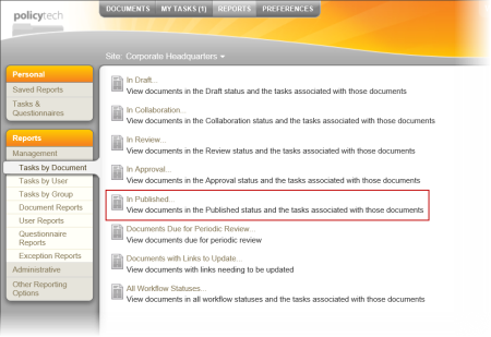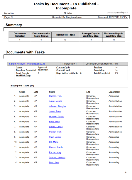 Shows the status of all tasks for documents in the published status. You can choose to include only those tasks that are incomplete, overdue, or completed.