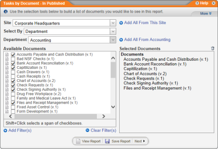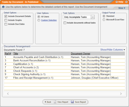 - By default, only the documents from those you selected that have tasks matching the current Task Options filters are included in the report. To include all selected documents in the report, even those without matching tasks, select the Include documents without tasks check box.