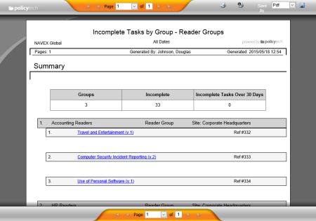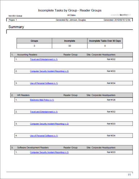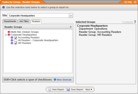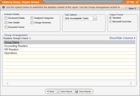 - Be aware that selecting a group in a Tasks by Group report has a different effect than selecting a group in a Tasks by User report. This report lists documents to which specific reader groups have been assigned. Documents assigned only to individual readers will not be included, even if the individual readers happen to be members of the selected reader groups.