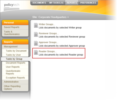 - Click Management, click Tasks by Group, and then click Reader Groups.