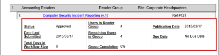 Provides details about the selected reader groups' assigned reading tasks. You can choose to include only those tasks that are incomplete, overdue, or completed.