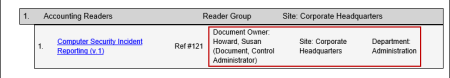 - Document Owner: For each document listed in the report, adds the document owner's name, site, and department.