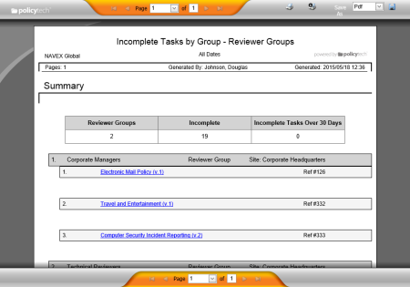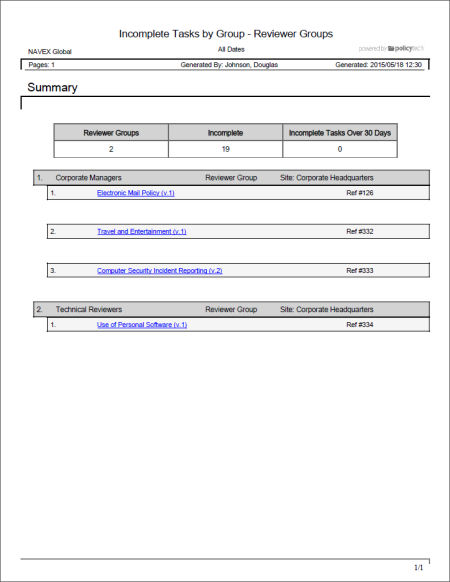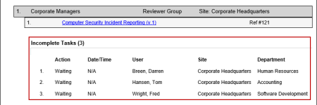 Provides details about the selected reviewer groups' assigned reviewing tasks. You can choose to include only those tasks that are incomplete, overdue, or completed.
