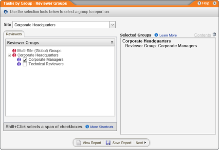 Important: Be aware that selecting a group in a Tasks by Group report has a different effect than selecting a group in a Tasks by User report. This report lists documents to which specific reviewer groups have been assigned. Documents assigned only to individual reviewers will not be included, even if the individual reviewers happen to be members of the selected reviewer groups.