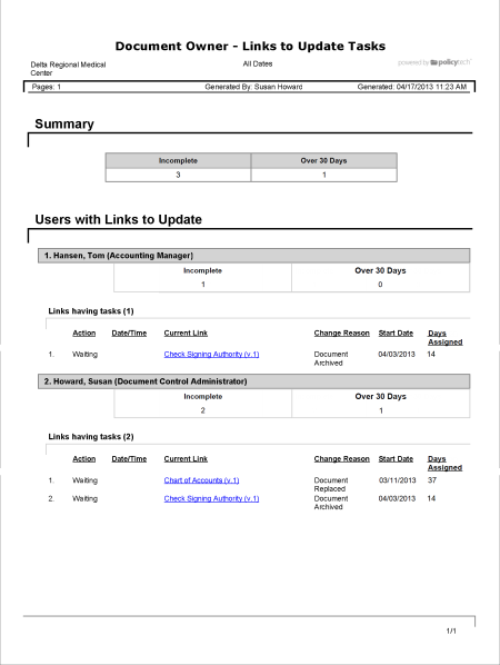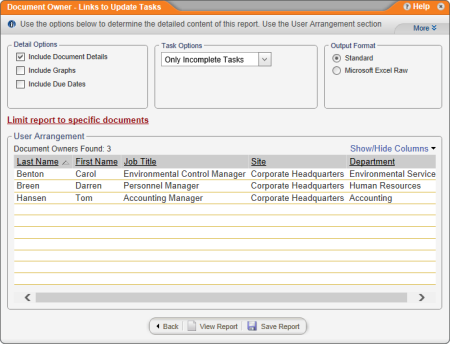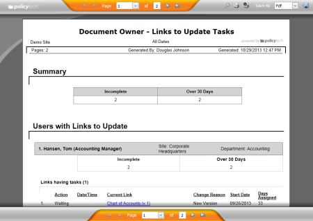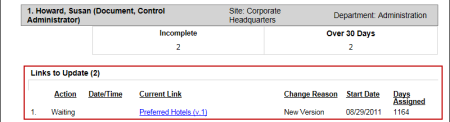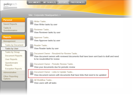 - Click Management, click Tasks by User, and then click Document Owner - Links to Update Tasks.