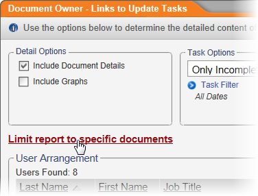 - To filter the selected users to only those assigned to specific documents, click Limit report to specific documents.