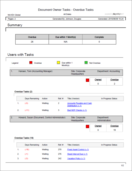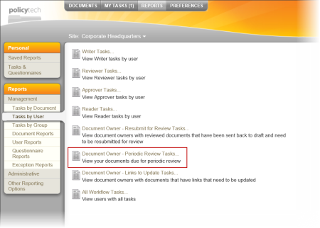 - Click Management, click Tasks by User, and then click Document Owner - Periodic Review Tasks.