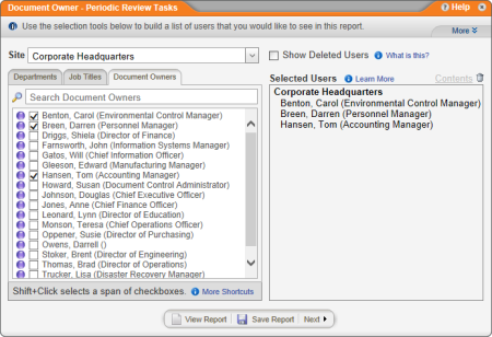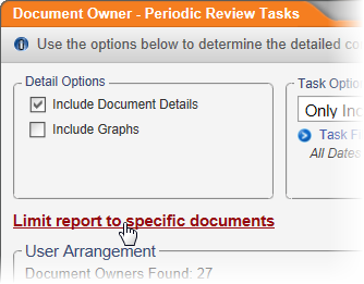 - To filter the selected users to only those assigned to specific documents, click Limit report to specific documents.