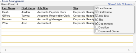 - The User Arrangement area controls what user information is included in the report and the user sort order. Do any of the following: