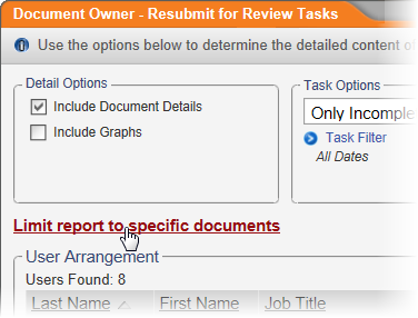 Provides details about the selected users' tasks for resubmitting a document for review after it has been returned to draft status from review or approval. You can choose to include only those tasks that are incomplete, overdue, or completed.