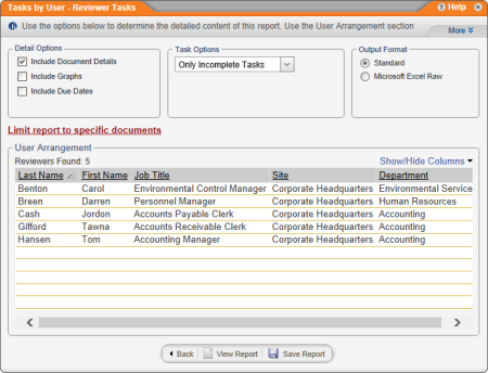 Provides details about the selected users' assigned reviewing tasks. You can choose to include only those tasks that are incomplete, overdue, or completed.
