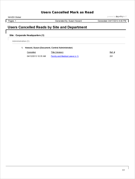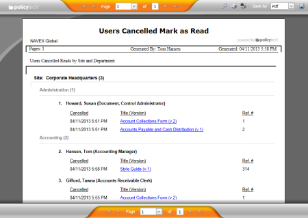Shows all users who clicked Mark as Read in a document and then, instead of clicking Mark as Read again to confirm, clicked Cancel.