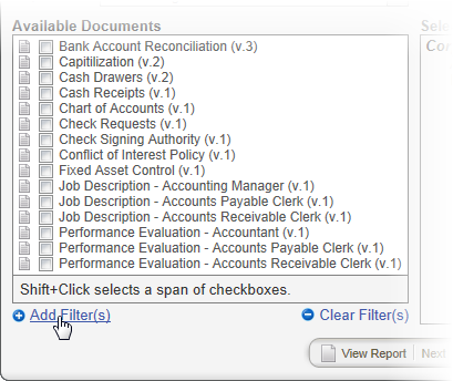 - With a list of documents displayed in the Available Documents window, click Add Filter(s).