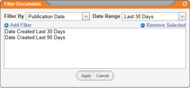 - (Optional) Repeat steps 2 through 4 to add another filter to work in combination with the first filter you added. For example, you might want to filter for only those documents that were created within the last 90 days and that were published within the last 30 days.