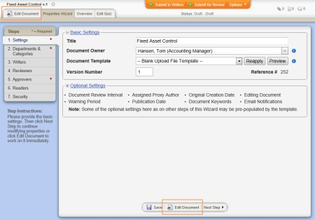 - If you currently have the document open and have the Properties Wizard, Overview, or Edit Questionnaire tab selected, click the Edit Document tab near the upper left corner or the Edit Document button at the bottom of the currently displayed Properties Wizard step.